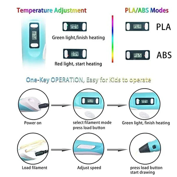 Easy to Use: Just plug in the pen, insert the plastic filament (PLA/ABS/PCL), and start drawing — no complex setup or software needed.